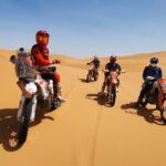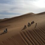 | Mercredi: Zagora-Chegaga (150 km) En quittant Zagora, nous suivons les pistes qui serpentent à travers l’immensité du désert, longeant les premières dunes et traversant des hamadas arides avant de rejoindre Tagounite sur des pistes rapides mais piégeuses. Ensuite cap à l’ouest pour atteindre les abords ensablés de l’erg Glioudi. Ses pistes roulantes nous mèneront progressivement au pied de l’erg Chegaga, où nous installerons notre bivouac pour la nuit. |